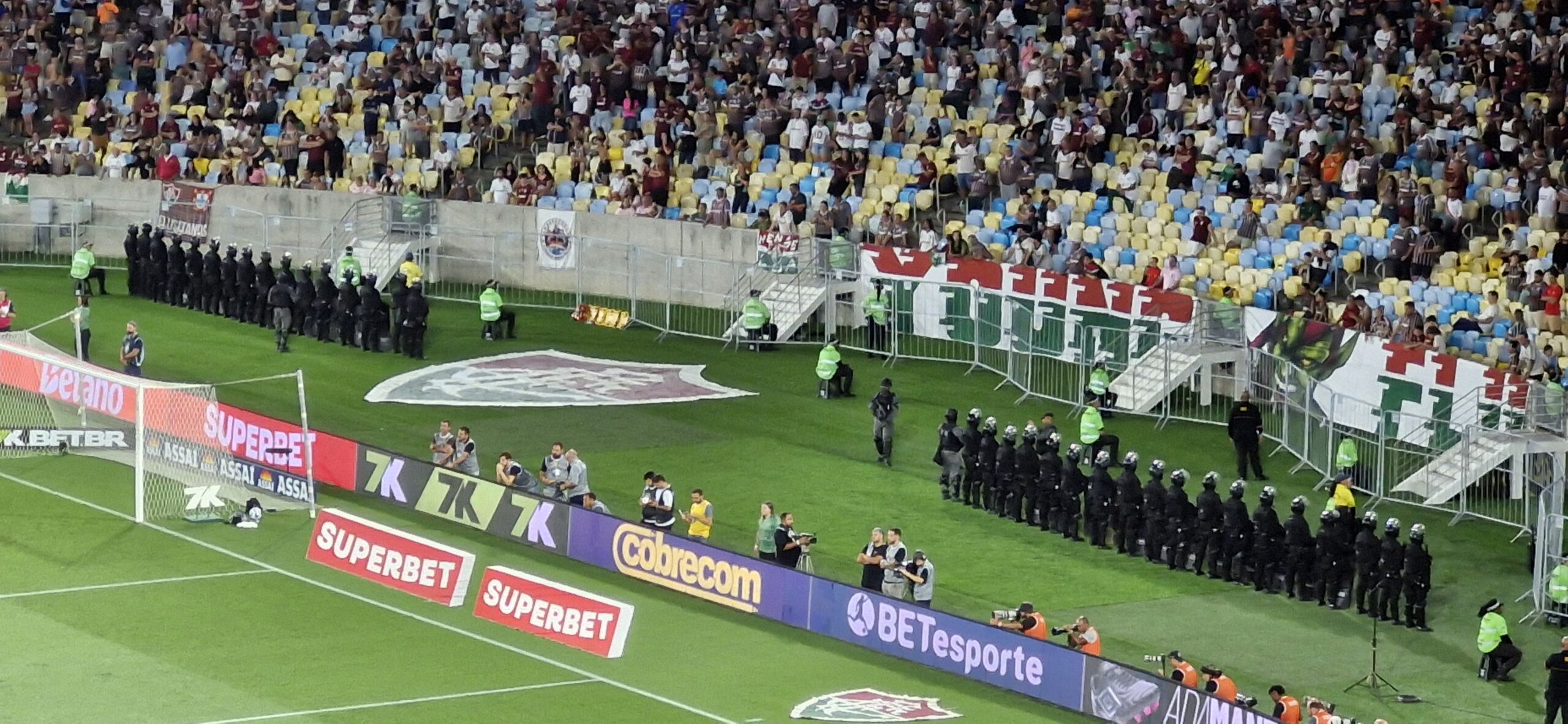 Algumas imagens hoje chamaram a atenção. Antes da partida, os efeitos de luz no gramado, em uma ação da Samsung S25 Ultra (não é o nosso, mas é Samsung). Depois o contraste da fumaça com as pessoas no Setor Sul e depois um impacto de ver um policiamento bem ostensivo de frente para o Setor Sul.