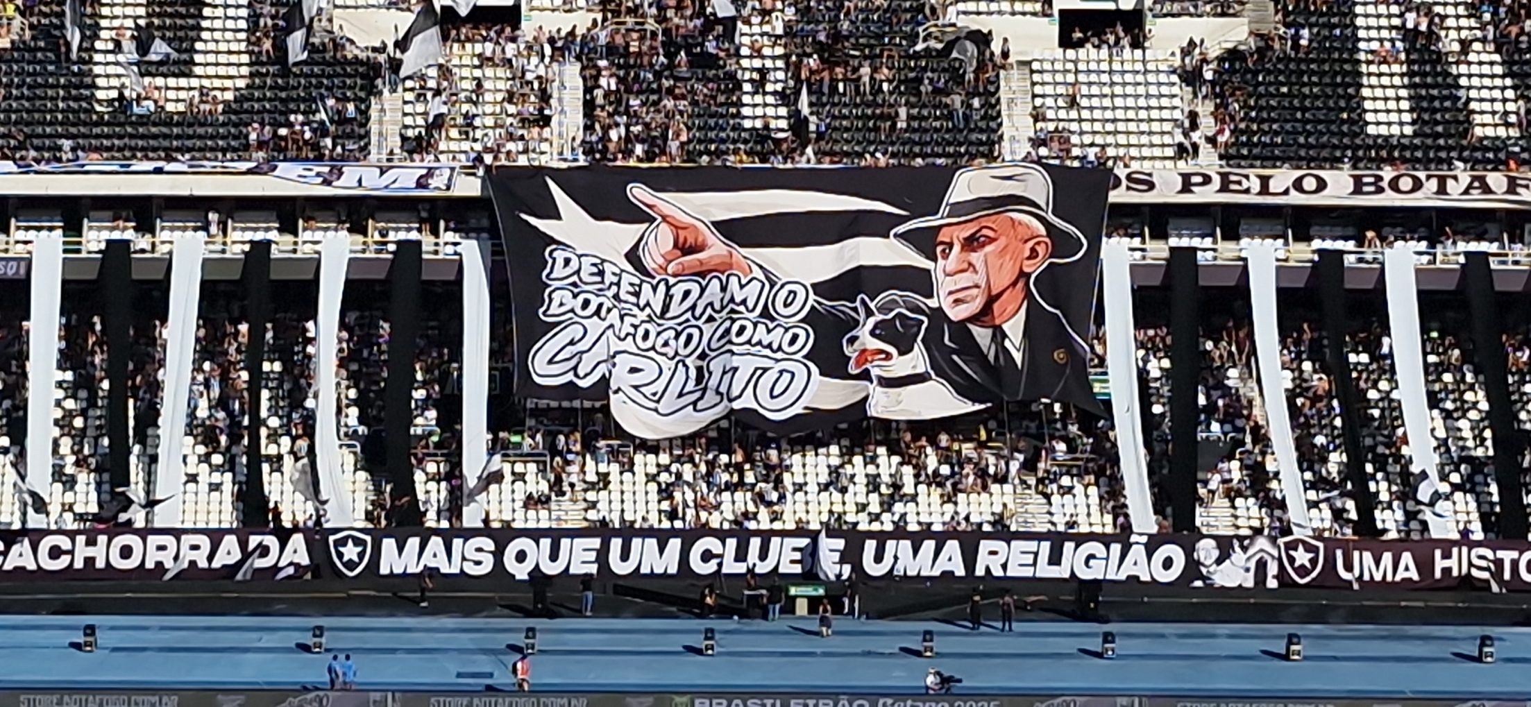 Como vem fazendo em quase todas as partidas, a Torcida do Botafogo abriu um bandeirão com recado para os jogadores. “Defendam o Botafogo como Carlito”.