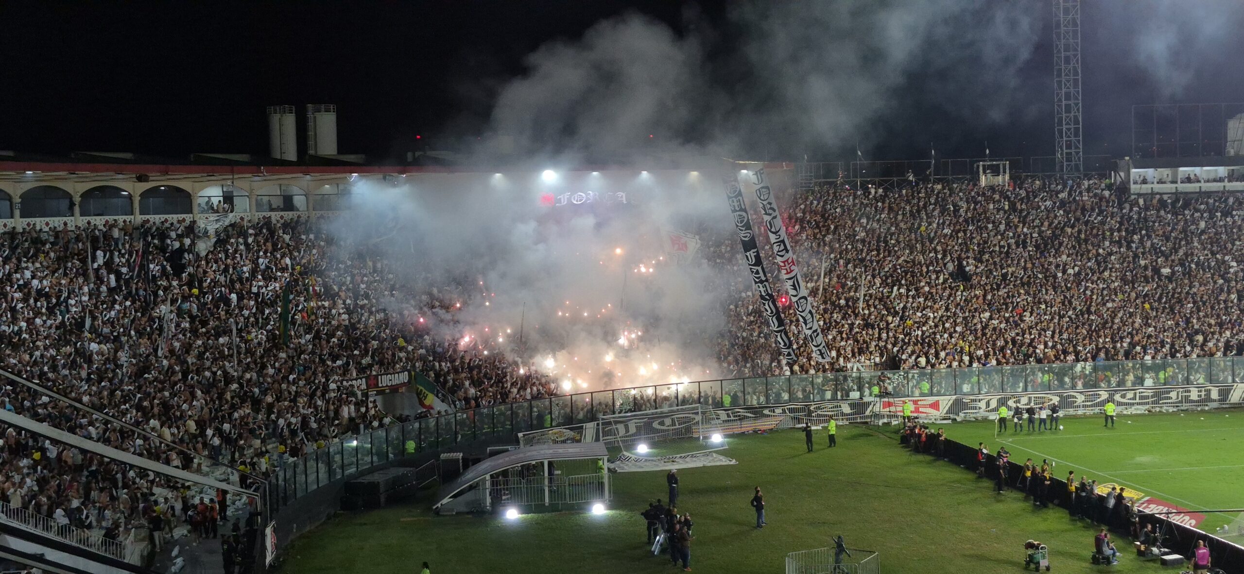 Durante a transmissão do jogo, recebemos comentários sobre porque a fumaça que apareceu no segundo tempo e parece ter atrapalhado a visibilidade. É que vários sinalizadores foram acesos nas arquibancadas e como foram muitos uma fumaça densa demorou a dissipar.