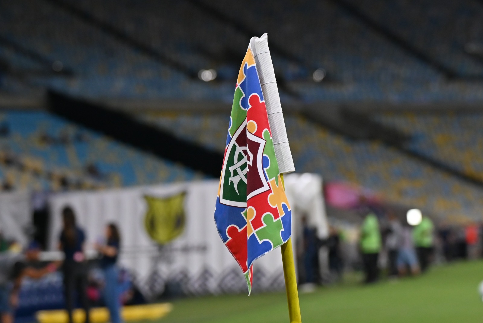 Registro também das ações pelo mês do autismo. Bandeirinha de escanteio, mensagens nos painéis e faixa no gramado fizeram alusão ao “mês de todos”, nome da campanha.