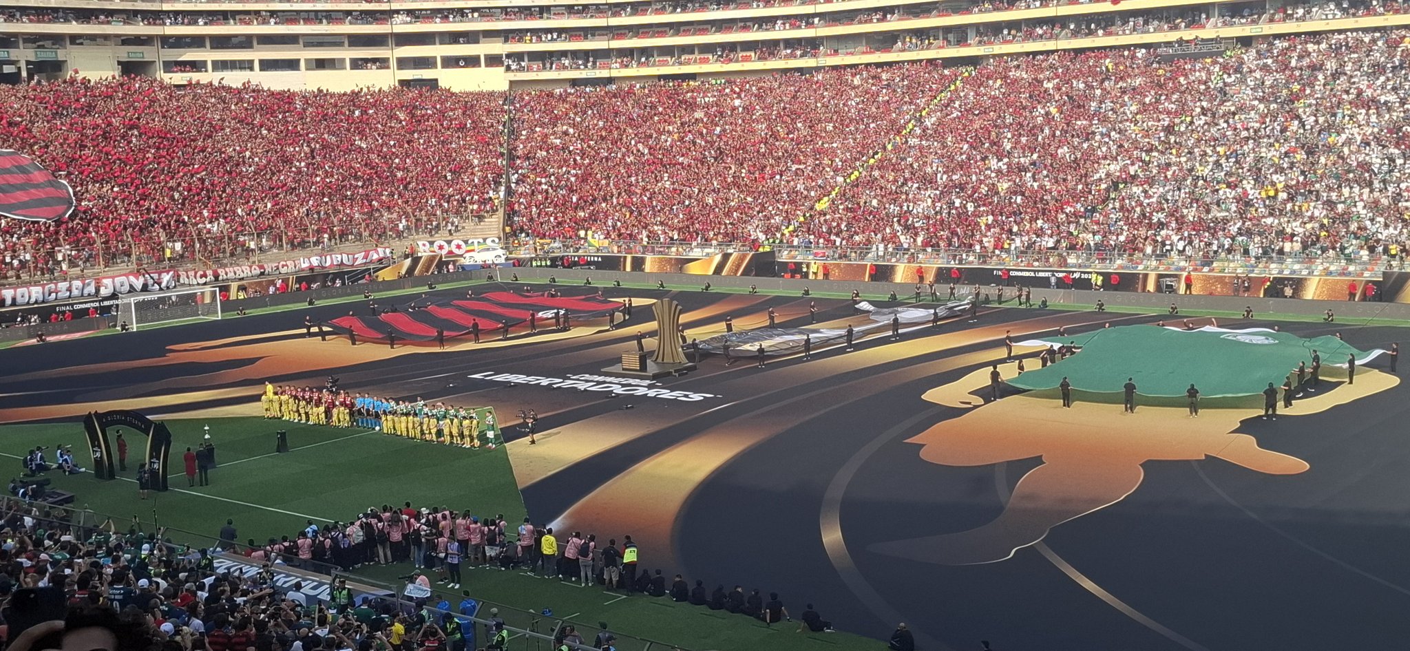 Os portões foram abertos por volta de 13h. Alguns torcedores do Flamengo relataram problemas com itens permitidos ou não no estádio, como cinto, bandeiras e outros itens pessoais. Além disso, foram barradas 5 mil bandeirolas da torcida do Flamengo, ao tentar entrar com elas, os seguranças mandaram retirar a haste, o que causou problemas. No estádio, o público entrou cedo, faltando 1h30 para o início da partida, as arquibancadas já estavam cheias, com a galera cantando bastante e curtindo as dinâmicas da Conmebol, como câmera do beijo, jato de camisa, entre outros.